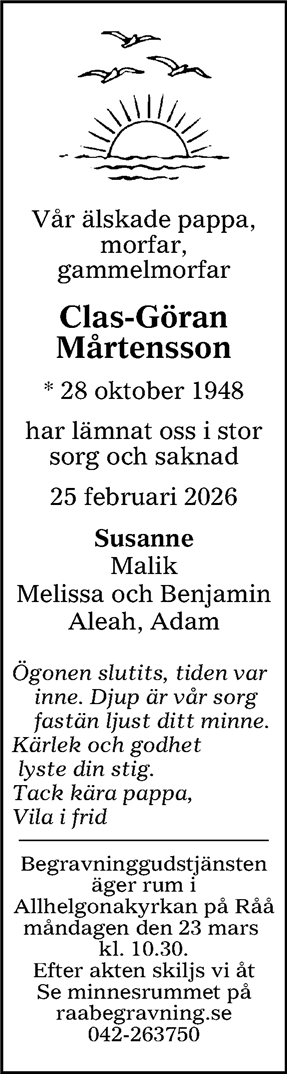 Anmälan till minnesstund är stängd. Kontakta oss på telefon 042 – 26 37 50 eller e-post info@raabegravning.se för mer information.