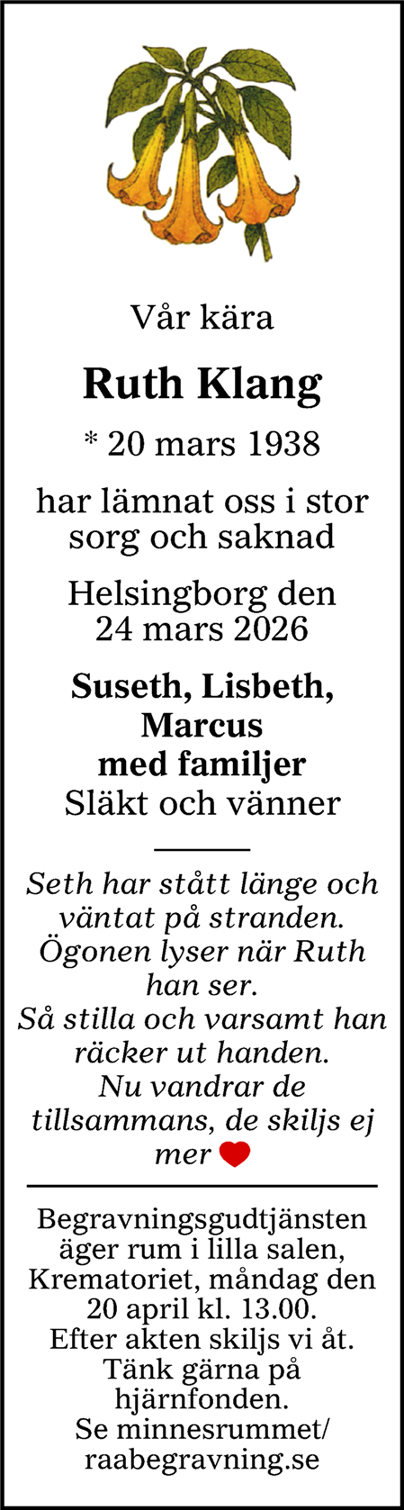 Anmälan till minnesstund är stängd. Kontakta oss på telefon 042 – 26 37 50 eller e-post info@raabegravning.se för mer information.